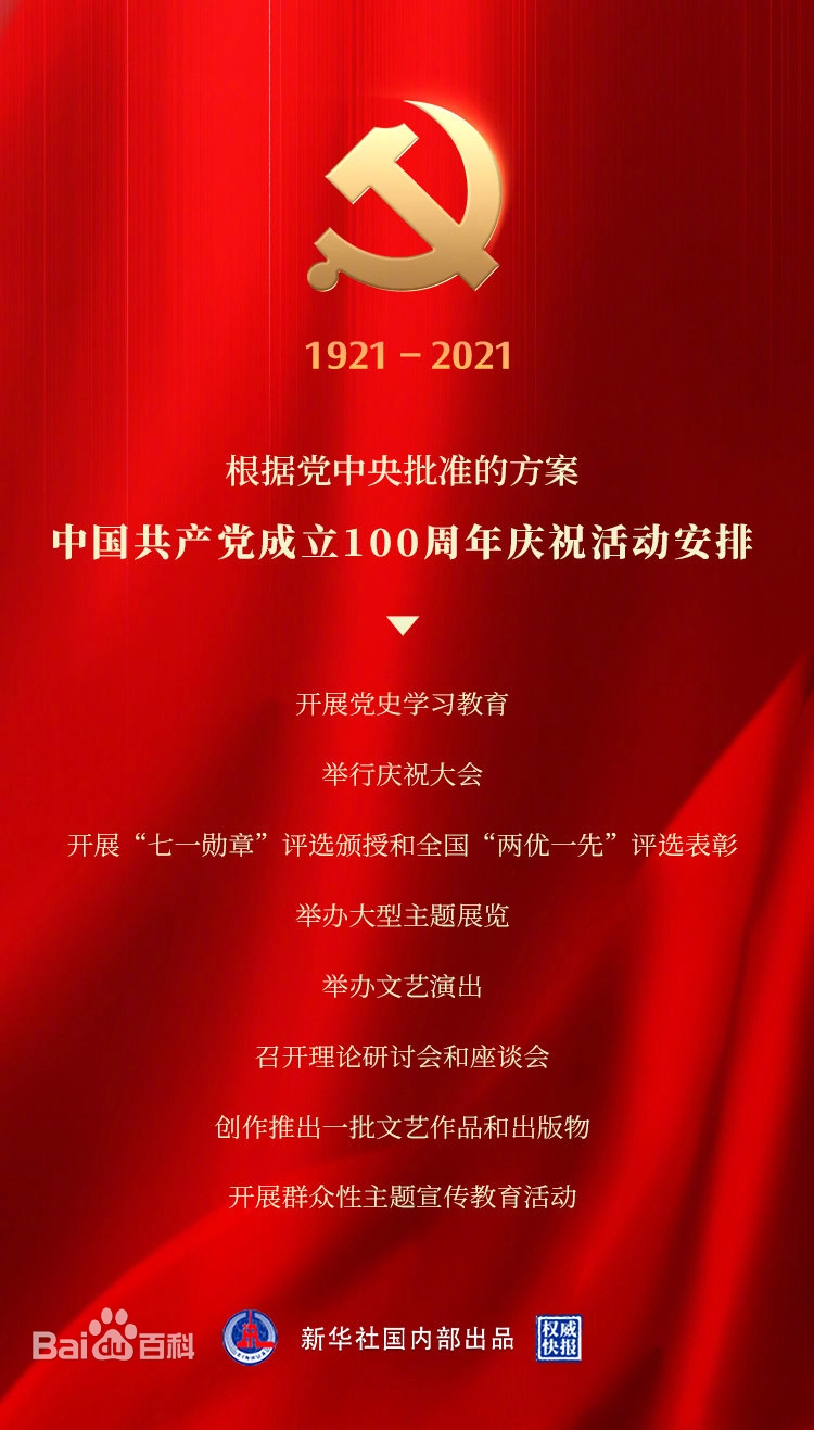 2021年3月23日,中宣部介紹中國(guó)共產(chǎn)黨成立100周年慶?;顒?dòng)八項(xiàng)主要內(nèi)容 。3月24日,中宣部發(fā)布中國(guó)共產(chǎn)黨成立100周年慶?;顒?dòng)標(biāo)識(shí) 6月26日,慶祝中國(guó)共產(chǎn)黨成立100周年活動(dòng)新聞中心在北京梅地亞中心正式運(yùn)行 。